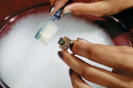 Gold-framed stone can be cleaned in a sugar solution. Take 2 tablespoons of sugar in a glass of water, mix it thoroughly and put a gold jewelry in it for 8-12 hours.