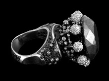 Itay Malkin became the designer of this bright, unusual and spectacular decoration. The peculiarity of the ring is that it is decorated with a luxurious black diamond of five carats. It is surrounded by colorless small pebbles, and the frame is made of 18 carat white gold.
