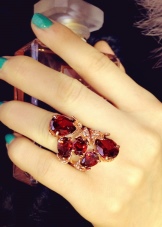 Golden rings with sensual garnet are very popular. This stone is distinguished by its bright and saturated color, which is able to effectively transform the female image and make it more attractive.