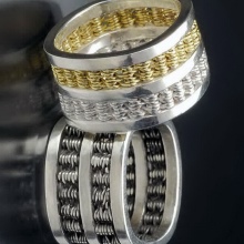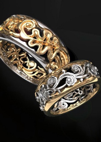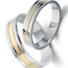 Often, newlyweds fail to agree on a choice between a silver and a gold ring. Then an excellent option would be a decoration with an insert of gold. This option will be in perfect harmony with all jewelry made of gold, silver and platinum. The combination of two colors of metals adds originality, and attracts the attention of others. In addition, the cost of such a model is noticeably lower than that of only gold.