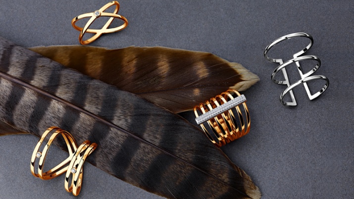The trend of this season is double rings. The brand produces trendy jewelry in pink and white gold with precious stones. The design of such models is distinguished by its elegant lines and minimalist design.