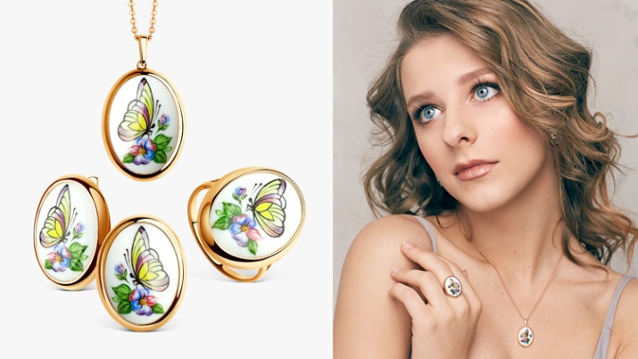 Enameled drawings are presented in a rich palette and are applied to precious metals. Such a coating is perfectly combined with precious and semiprecious stones. Luxurious diamonds are no exception.