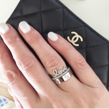 Round-cut diamonds effectively cover the base of the ring in the form of an inscription. The product is made of white gold, thanks to which it looks not only spectacular, but also expensive. A simple design combined with expensive material makes it an incredibly stylish purchase for a girl.