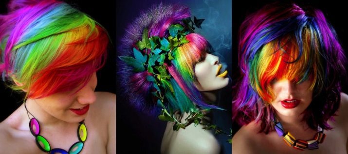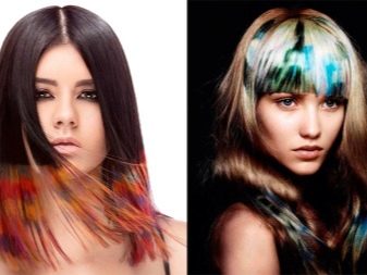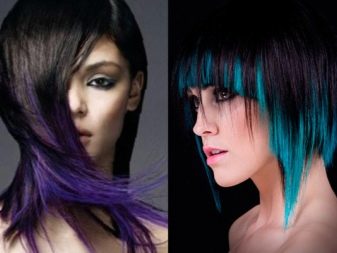 - selective or zonal coloring of individual hair strands - bangs, temporal parts using bright and saturated colors: blue, purple, red, green;