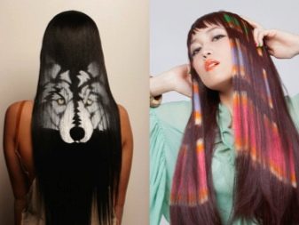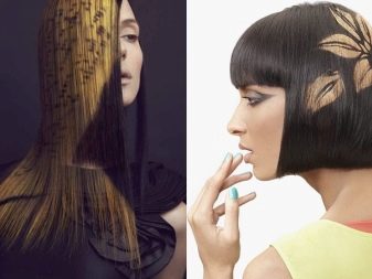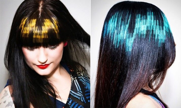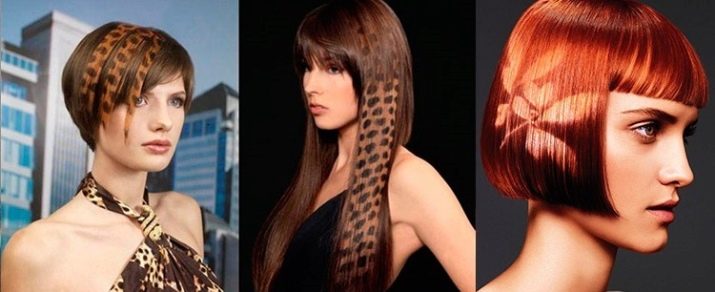 The most common drawings and patterns: leopard and tiger drawings, oblique lines with an emphasis on bangs and eyes. Often, only bangs are given to the patterned part of the hair, which in successful execution only gives greater clarity to facial features.