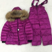 The set includes pants with suspenders and a warm down jacket, which is decorated with inserts and pompons from rabbit fur.