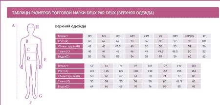 After a year, two more sizes are added to the main sizes - 2T and 2X. If you convert them into a formula, you get: 2X = 2T + ½ size. Also, overalls have a dimensional mesh along the sleeve, that is, the distance from the neck to the wrist and the length without booties. The grid is very easy to use and easy to navigate.