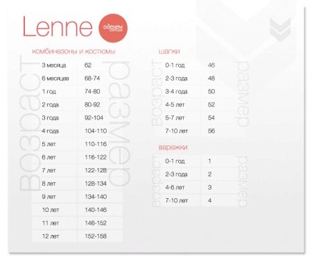 Overalls from the Lenne brand are designed for children from birth to 17 years. They are represented by a dimensional grid from 62 to 158, which coincide with the growth of the child. Models for babies can be bought in larger sizes. For example, for a child of three years old, a jumpsuit from 92 to 104 is ideal. For a child of six years old, it is worth purchasing a model from 116 to 122 sizes. At ten years old, you should already look at sizes from 140 to 146.