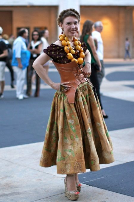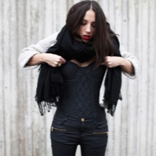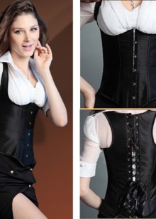 - Corsets can also be used as an independent element of the image. The laconic design of such corsets allows you to wear them over dresses or blouses. In this case, the image will change dramatically. Bold young ladies choose leather corsets, which, when combined with simple things, give an image of dangerous sexuality. Also, everyday corsets can be worn directly on the body, making the figure more refined. Perhaps the most successful combination is based on the use of a corset, a blouse with lace elements and a long loose skirt.