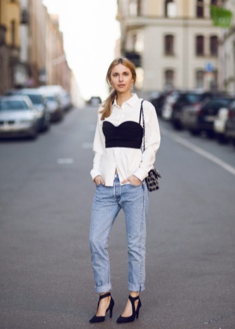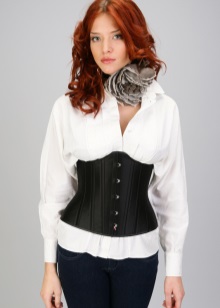 But a good example of how a corset can be used in everyday looks. An ordinary white shirt is transformed due to a black corset that highlights the waist and lifts the chest. In this way, you can even go to work if the dress code is not very hard and you will not feel sorry for men who cannot look away from such beauty.