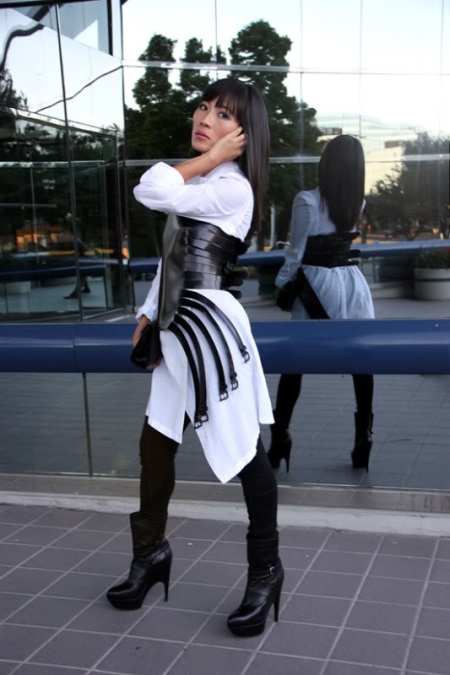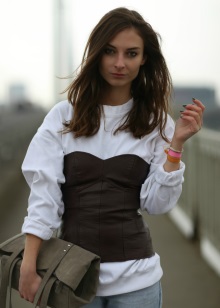 A leather corset fits easily into everyday looks, combining with jeans and trousers, the belt of which will be covered with a corset or bordered by it. Leather corsets need to be introduced into the image very carefully and avoid cheap accessories so that the image does not look vulgar.