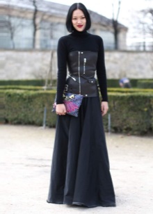 Stylists advise wearing a black leather corset top with a flowing skirt or dress on the floor. Or a corset under the chest with an evening dress to the knee. This combination emphasizes the waist and adds volume to the chest. Complement this look with feminine jewelry and stilettos.