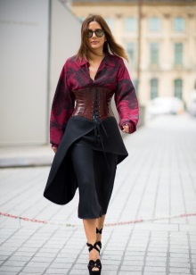 Leather top corset can be considered a universal option. It can even be worn in the office in combination with a turtleneck, or if the corset is black, then in combination with a contrast blouse. For the bottom, it is best to choose straight cut trousers or a pencil skirt for such a set. Pump shoes will help complete your office style with a leather corset.
