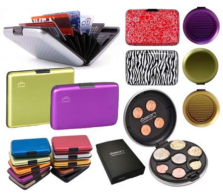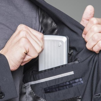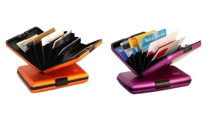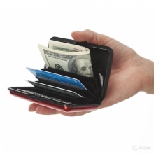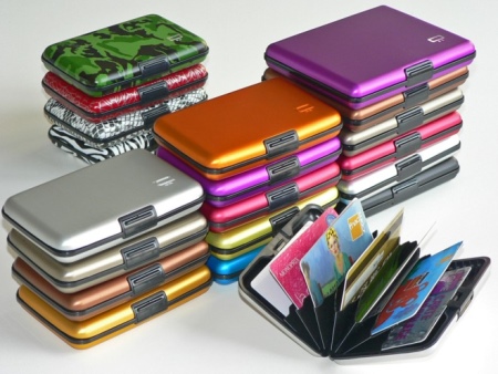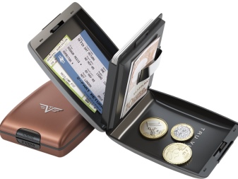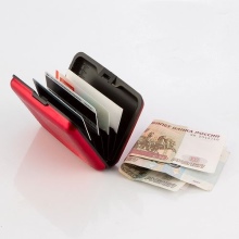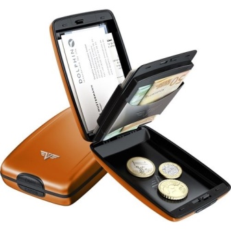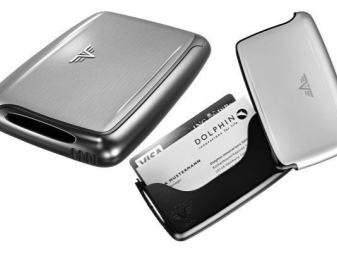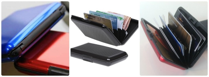 These multifunctional accessories are made of anodized aluminum. This material protects plastic cards from demagnetization. All compartments are equipped with convenient buttons.