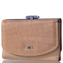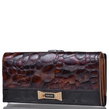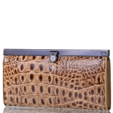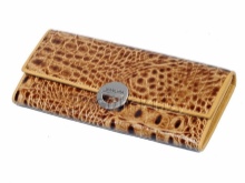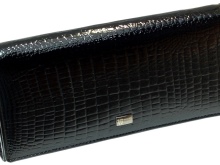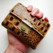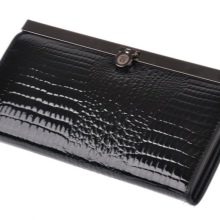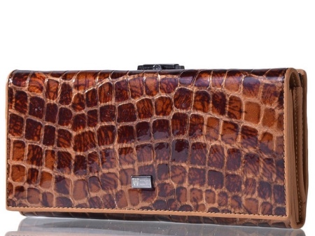 - A brown wallet made of genuine patent leather will surely appeal to practical girls. This color is quite versatile and does not attract excessive attention to the product. The main element of decoration is a print under the skin of a reptile and a golden company logo on the outside of the product. Due to the large size of the model, if necessary, it can be used as a theater bag. Closed with a clip, has two main compartments for paper notes and one internal for small items with zippers.