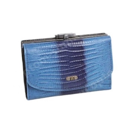 - Lovers of bright accessories will surely like a compact wallet in rich blue colors. As a decoration, a vegetable print is used, made on patent leather, which looks extremely impressive. The main clasp is a reliable strap on the button. The model has two sections for paper notes, a compact compartment for small items with a mechanical fastener, as well as a whole host of compartments for business cards and plastic cards.