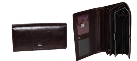 - A classic popular option is a roomy wallet in black or burgundy color. It is made in the form of an envelope and as a decorative element has a large round clasp with the brand name. It is large in size and fits on one palm. Very elegant, and therefore ideal for a business woman. Inside, it has two main sections and one for small things with a zipper, as well as one secret and one external additional pocket with a zipper.