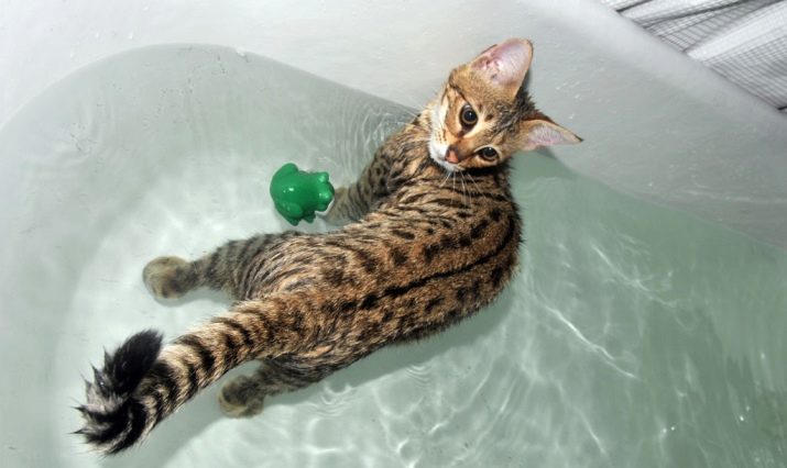 Unlike many representatives of their species, cats of this breed are very fond of water. They can spend hours swimming in ponds. If you fill a small container with water and put toys in it, you can entice your pet for a long time. They will catch objects from the water, like their wild ancestors fish during fishing. Flowers standing in the water, it is better to keep away from the animal to avoid damage to the subject.