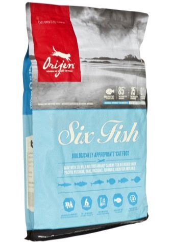 - Orijen Six Fish Cat. This holostik created on the basis of fish. It includes all the necessary elements for active cats. The composition of this product includes 42% protein and 20% fat. Protein is taken from various fish, for example, salmon and herring. This composition is optimal for the cat.
