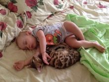Despite their rather wayward character, Bengalis feel and understand children very subtly. Even if the baby begins to put his pet in clothes or takes it by the tail, the cat will remain completely outward calm. Another advantage of the breed is full contact and understanding with dogs and cats of other breeds, therefore, it can be safely taken to a house where there is already some living creatures.