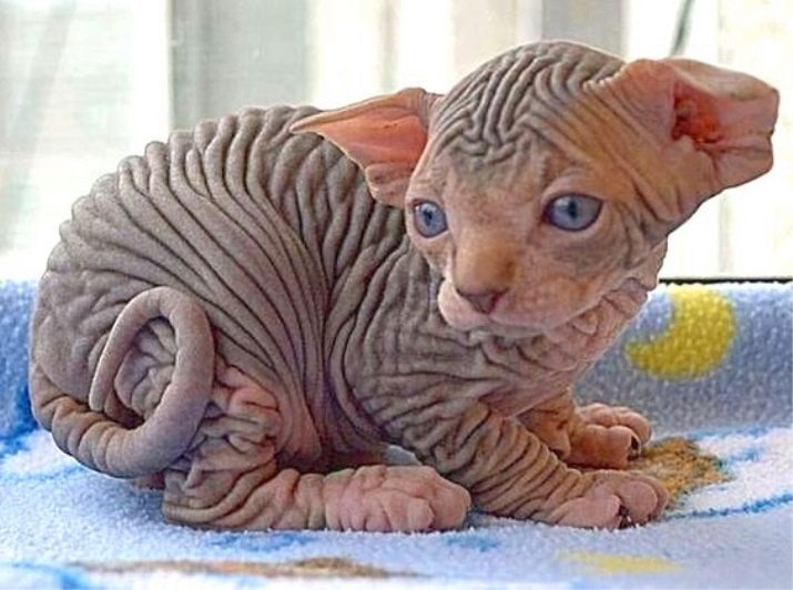 The shiny silky coat of the animal fits snugly to the body. The undercoat of the cat is missing, so you need to protect the pet from drafts.