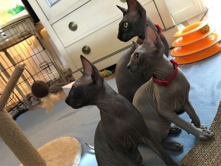The cat needs attention. Wipe her skin with napkins, if she perspires, bathe often, otherwise the sweat of the animal will stain your clothes and furniture. This is a common feature of all sphinxes.