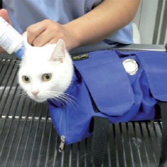 Other groomers use a leash, putting it on a cat during a haircut. Still others prefer a special bag-clamp, which simplifies carrying out various manipulations by a specialist. Bags are used to simplify injections in any of the limbs, care for the ears and eyes. In fact, this product is somewhat like a straitjacket for a violent pet.