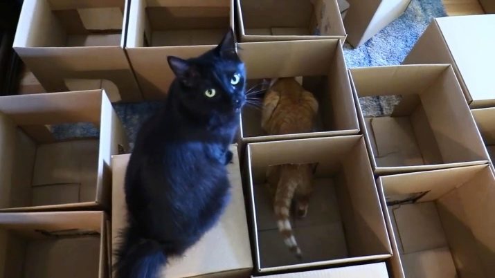 Great labyrinths for cats turn out from simple cardboard boxes. You just need to take several of these items and fasten to each other, making holes of different sizes, so that overcoming obstacles is more interesting. It is better to fasten the different parts of the maze together, not in a straight line, but by making turns and branches.