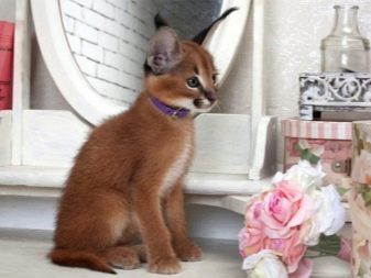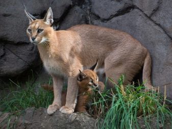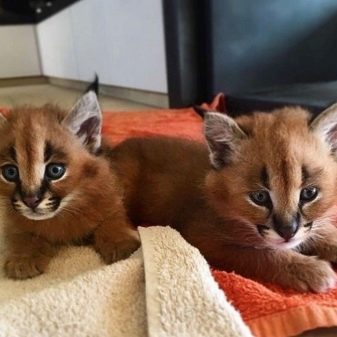 Caracat kittens are born weighing 115 grams. They lack vision, and their ears are horizontal. On the 25th day of life, the cubs are perfectly on their feet and begin to walk independently. By the month their ears grow almost twice and have half-centimeter brushes. The almond-shaped eyes of a kitten are usually colored in honey or blue-green.