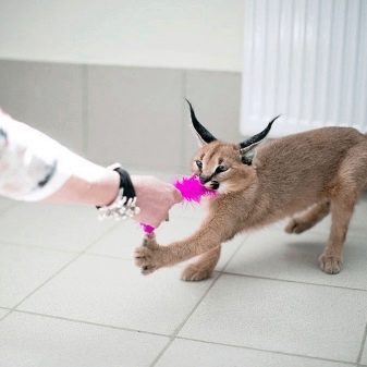 When playing with a caracat, you should not use your hands and fingers, as an adult can harm a person without wanting it. As toys, balls and mahalka are suitable for him. The feather accessory can only be used for kittens aged 3-4 months. When choosing toys, it is better to give preference to objects of high strength. If the attribute of entertainment is constantly available to the animal, then it will lose interest in it.