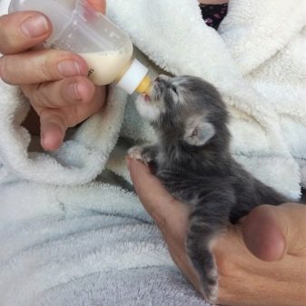 The first attachments to the bottle for the baby will be debilitating, as he will not be able to suck food on his own. In this case, the owner will have to squeeze out a little milk so that the kitten gets drops in his mouth. Perhaps the kitten after several feedings will be very hungry, as it does not receive the necessary amount of food, so it quickly figure out how to eat with the help of the nipples. In addition to milk, kittens should be given warm water, but not from a bottle, but from a pipette or syringe. So the first 3 weeks of the life of a fluffy baby should pass.