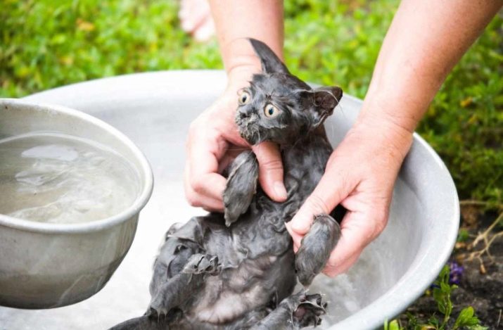 The situation is more complicated with the sphinxes, the bathing of which should be approached with special attention. Some breeders of this breed wash their pets about 2 times a month, others prefer to alternate bathing with rubbing the pet with a damp cloth.