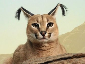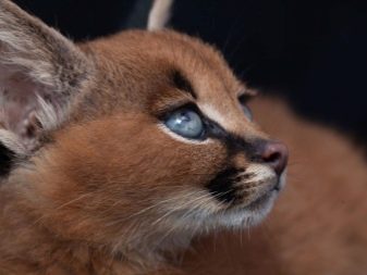 The cat is similar to a lynx, but typologically it is referred to as a puma - she has a strong body with developed muscles, a long tail, elongated paws, the height of the cat at the withers is 30-50 cm. The color of the caracal is uniform, fiery red. On the muzzle on both sides there are two spots of a darker color, on both sides of the nose there is a black stripe and the same color of the contours around the eyes. The nose itself is dark in color. The eyes are large, tea-colored. Ears are very long with black tassels.