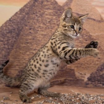 All other varieties of savannah, the so-called F3, F4 and so on, are the result of selection of the serval with other purebred breeds. It is believed that the larger the number after the letter F, the less in this variety of data a purebred African serval. Another well-known species of savannah is a variety created by crossing a serval and a cat of the Egyptian Mau breed.