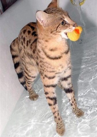- Unlike most cats, savannahs are great for water procedures. Here we are not talking about a full bath, but about water games and entertainment. Especially these pets love to play with toys floating in the water. They also love to lower their paws into the water in order to cool, wash or play.
