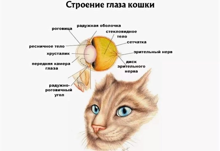 The figure shows a schematic structure of the cat's eye. Each element serves a specific purpose. Their functions and characteristics determine the peculiarity of cat's vision.