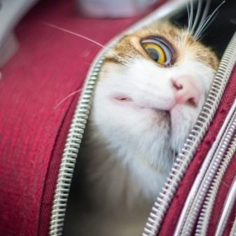 - Bag for transporting small animals - she does not have a rigid foundation and supports, so the cat will be uncomfortable staying in it for a long time, as there will be a desire to find some kind of support. The fabric walls do not allow air to pass through, which is why after some time the pet will begin to suffocate in such a bag. This option is convenient for small trips, for a long journey is not suitable.
