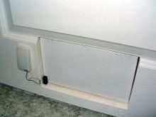 The complexity of the installation depends on the material of which the large door is made, as well as the presence of stiffeners, panels, glass inserts and so on. If the door is wooden, it is not difficult to install a cathole for a cat by following these steps: