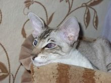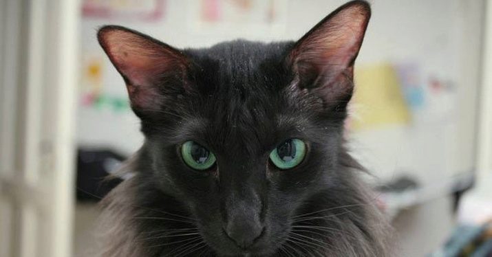 The neck is long, beautiful, with a head with a regular wedge-shaped shape. The javanese ears are set wide, they are large, with pointed tips. The muzzle of the cat is characterized by an elongated shape and rounded cheeks. The nose is long and straight. The eyes of the pet are almond-shaped, they are widely set and mow a little. The color of the visual organs can have any shade of green or blue.