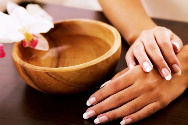 Another way to pamper your hands is to make baths for them. Vegetable oil is heated in a water bath to a temperature of no higher than 40 degrees. A little sea salt and a few drops of essential oils are added to the warm oil. Fingers dip in the aromatic mixture for 15-20 minutes. After the procedure, the handles are wiped with a napkin. If desired, you can put on cotton gloves and stay a bit in them. If there are wounds on the handles, then it is better to do without salt. If there are no essential oils in the house, you can use lemon juice. Such bathtubs will simultaneously benefit m joints.
