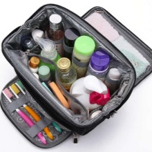 The last type of travel cosmetic bag is hiking. This is a type of handbag for cosmetics, which collects all kinds. The model has large dimensions, comfortable handles, soft material and unbreakable mirrors inside. It is very convenient to use for travel.
