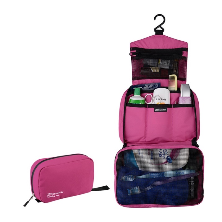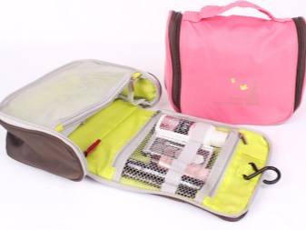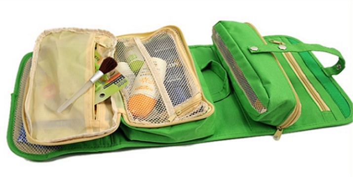 Folding travel cosmetic bag easily turns into a cabinet. It's simple - she has a hook. After all the transformations have occurred, use this hook to attach the makeup bag to the wall. She has deep pockets where you can easily put different sprays and shampoos. The folding bag should have opaque pockets for personal hygiene items.