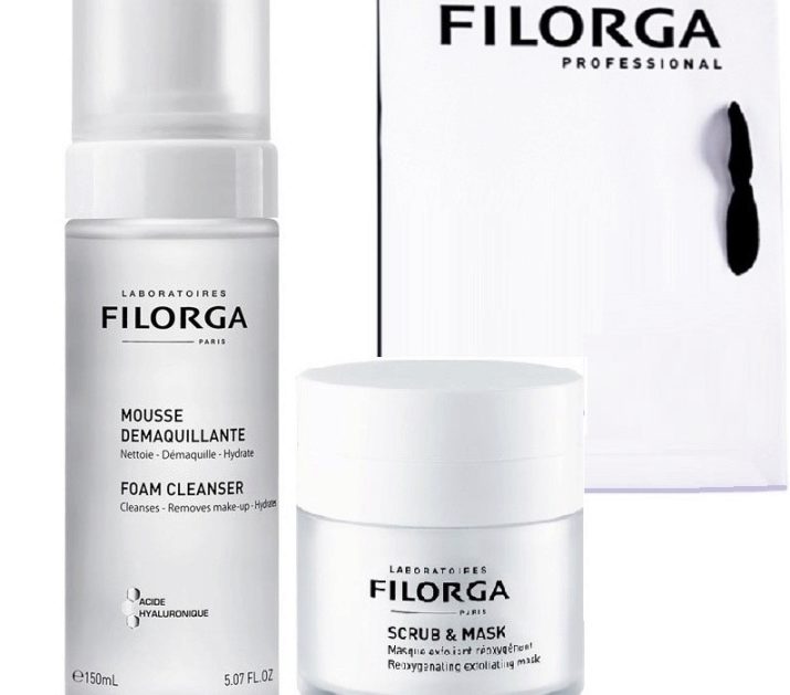 - Purification Filorga Set - This is a mousse that removes makeup and a scrub mask. Regular use of the mousse makes the skin soft, ready for subsequent procedures. A scrub mask exfoliates dead cells and fills the dermis with oxygen, restores elastin, moisture level, smooths wrinkles.