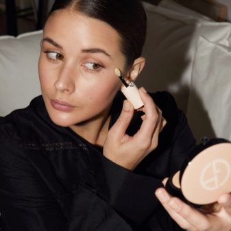 Armani always said that makeup should not only emphasize the virtues of a woman’s face, but also hide the imperfections, have a skin care effect. The most popular were tonal foundations. They have tons of benefits that have been proven by millions of women. Means as if masked as a decorative product.