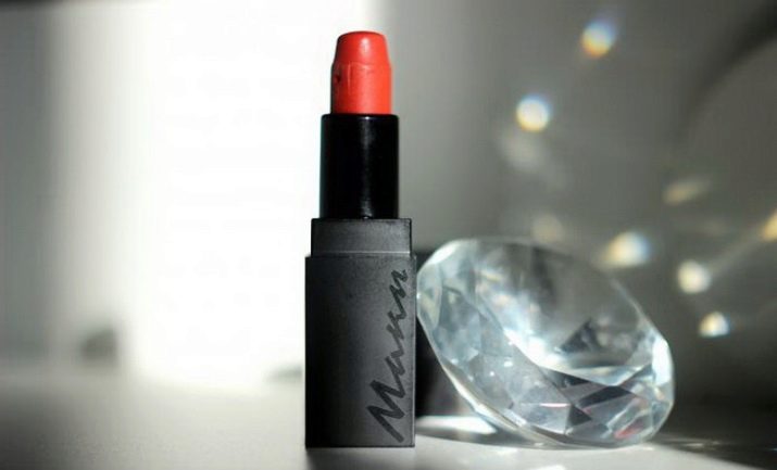 The composition of the product includes: cocoa butter, rice bran wax, unrefined coconut oil, mango oil, beeswax, iron oxide, D&C Red Lake organic dyes, avocado oil, titanium dioxide. Lipstick "Maki" is well pigmented and nicely lays on the skin of the lips. It turns out a deep shade with a slightly damp sheen.