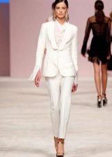 A snow-white suit always looks very elegant and fresh. Especially when the white color is presented in such an elegant and feminine costume design. Laconic jewelry and a black bag complement the look.
