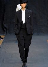 Despite the fact that shoes or ankle boots are a traditional option for shoes that match a classic suit, modern designers offer to expand this line by combining a suit with different options for sports shoes, for example, sneakers or sneakers. Typically, this image is characteristic of a youth or informal style. The jacket can be worn on a naked body, trousers have a shortened length, various decorative elements and unusual jewelry are acceptable.