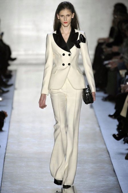 The traditional colors for the classic costume are black, brown, gray or white. A black or white suit looks appropriate in any environment and blends perfectly with other clothes, shoes and accessories. A combination of contrasting colors looks very stylish and unusual, for example, a black jacket - a white skirt or vice versa.