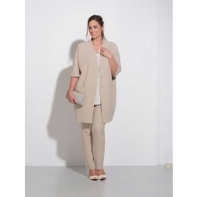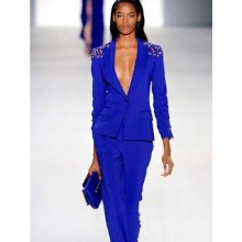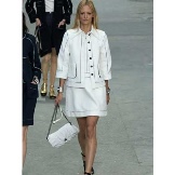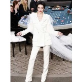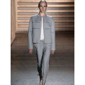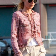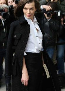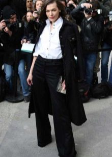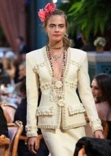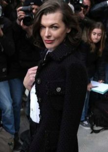 An even more courageous version of the ladies' outfit in the Chanel style is demonstrated by the heroine of exciting blockbusters - Mila Jovovich. Such a trouser suit is especially suitable for a woman of a mature age, emphasizes the solidity of her status and, possibly, the power of character.