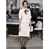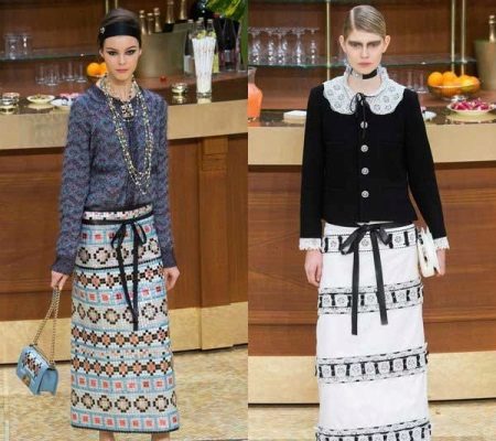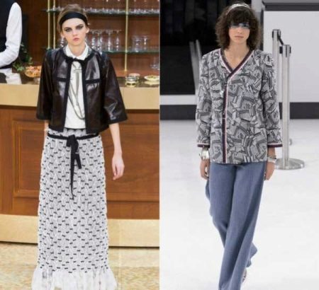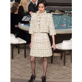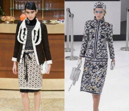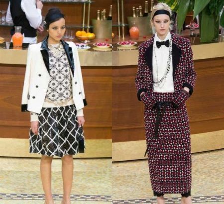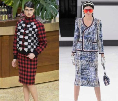 For lovers of Art Nouveau clothing Chanel offers both options with non-classic skirts, for example, pleated, and sets with shorts or with tight trousers. At the same time, a shawl collar, fringe trim and other interesting innovations are possible in the design of the jacket.